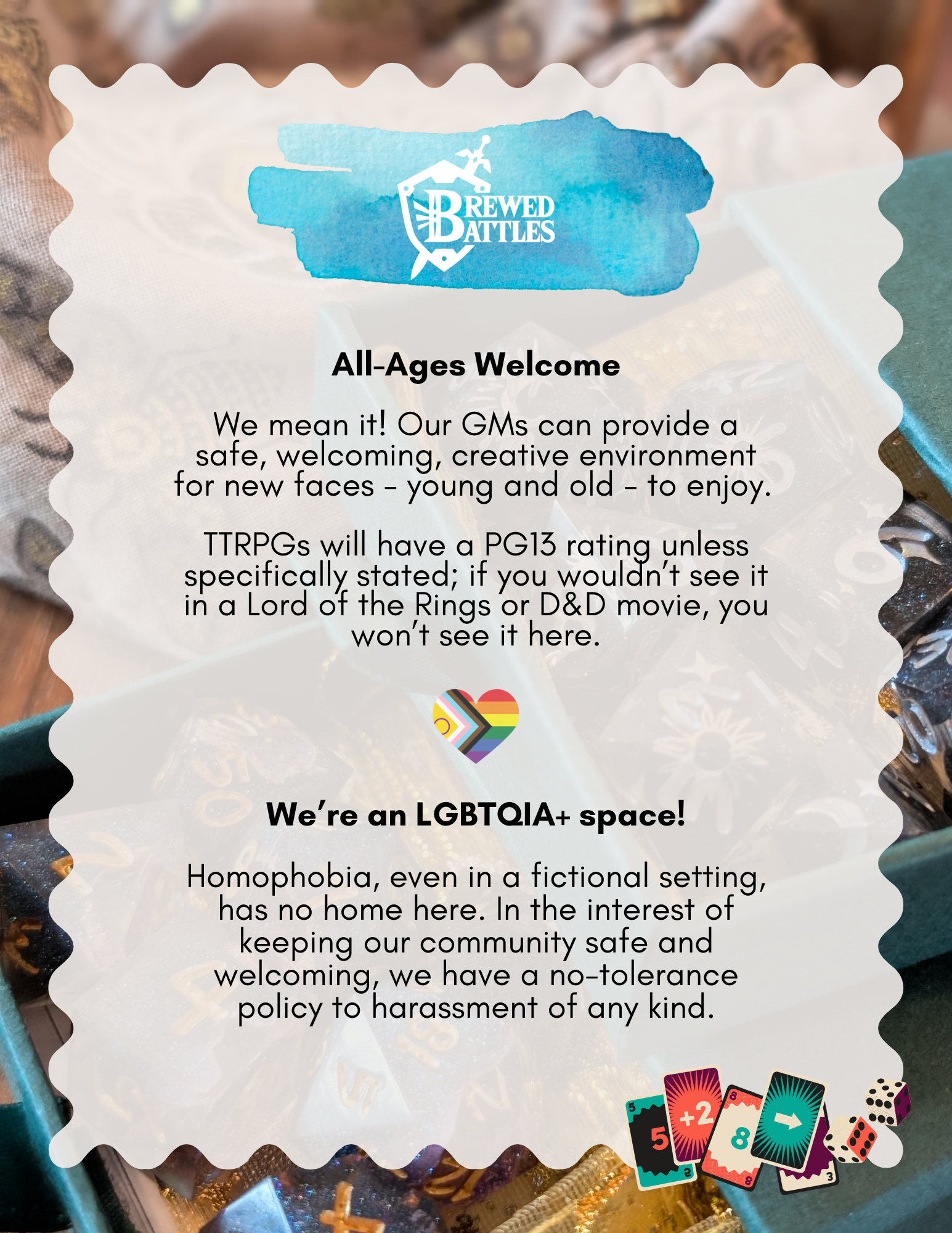Host your next TTRPG session at Brewed Battles! We can offer a quiet, cozy space for as many players as you have at just $5 per head ($10 on evenings the shop isn't already open - but we're happy to be open anytime you need).