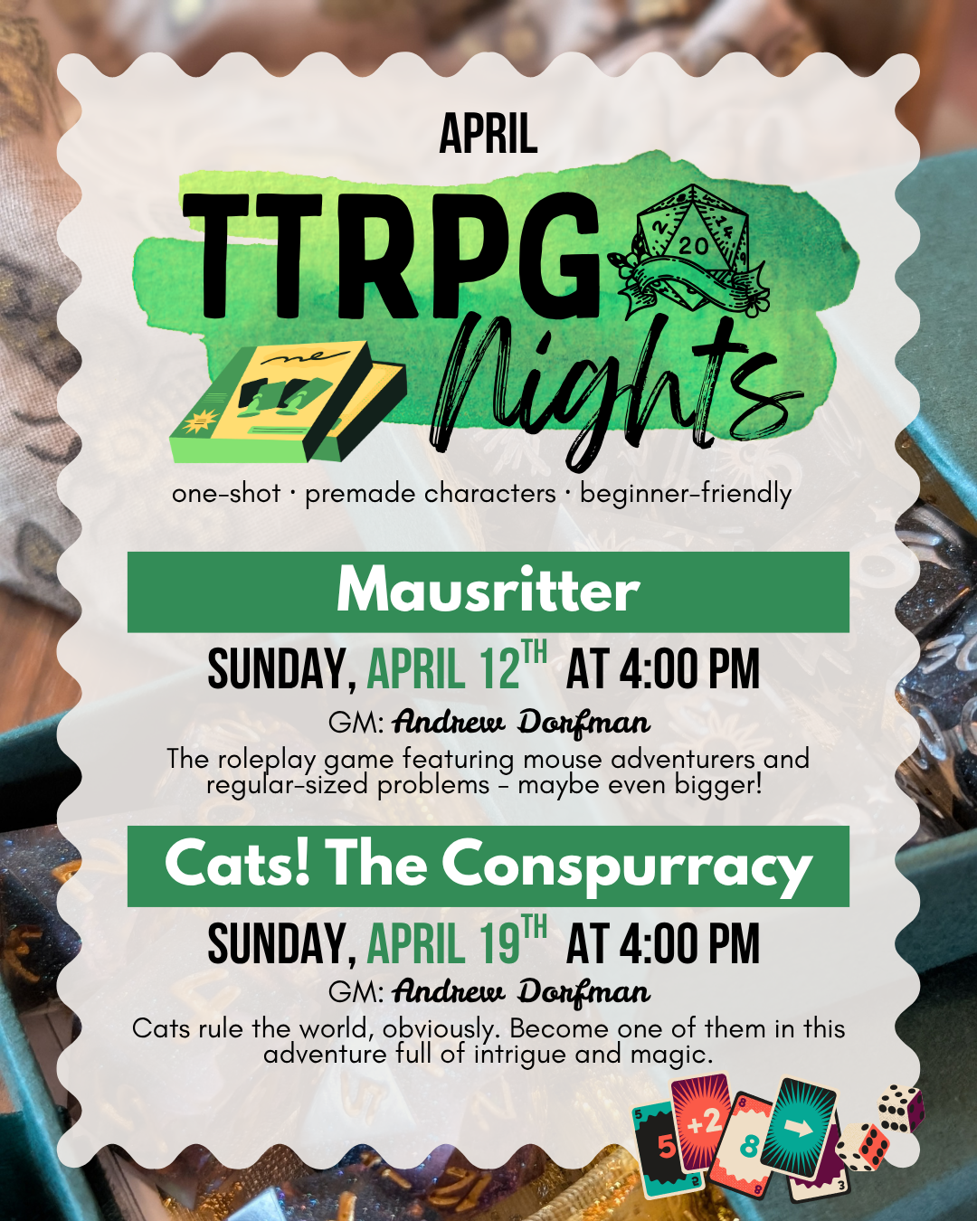 We run special events every month too! From Miniature Paint Nights to TTRPG Nights hosted by professional GMs and enthusiasts alike, we've got something for you to enjoy coming up.